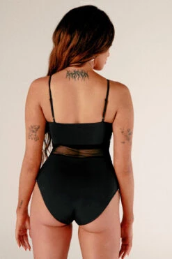 This little black number is the perfect combination of sporty and sexy. Full coverage bottoms with a flattering sheer mesh side panel.Â