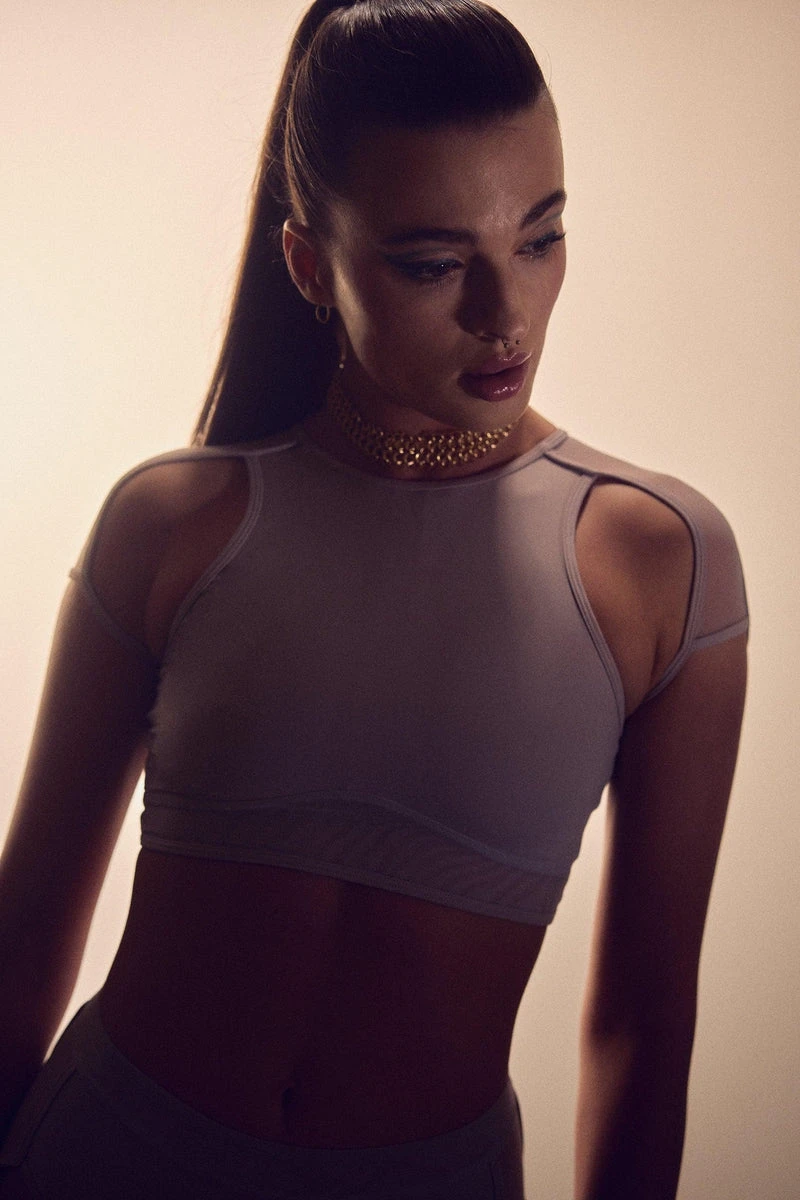 This stunning top from Hamade is sporty, elegant and contemporary all rolled into one! Featuring a high neck, shoulder cut outs and mesh shoulder panels.