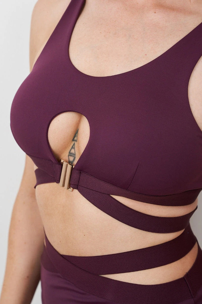 - Key Features: Front cut out detail | Mesh back | Gold clasp waist detail | Removable padding