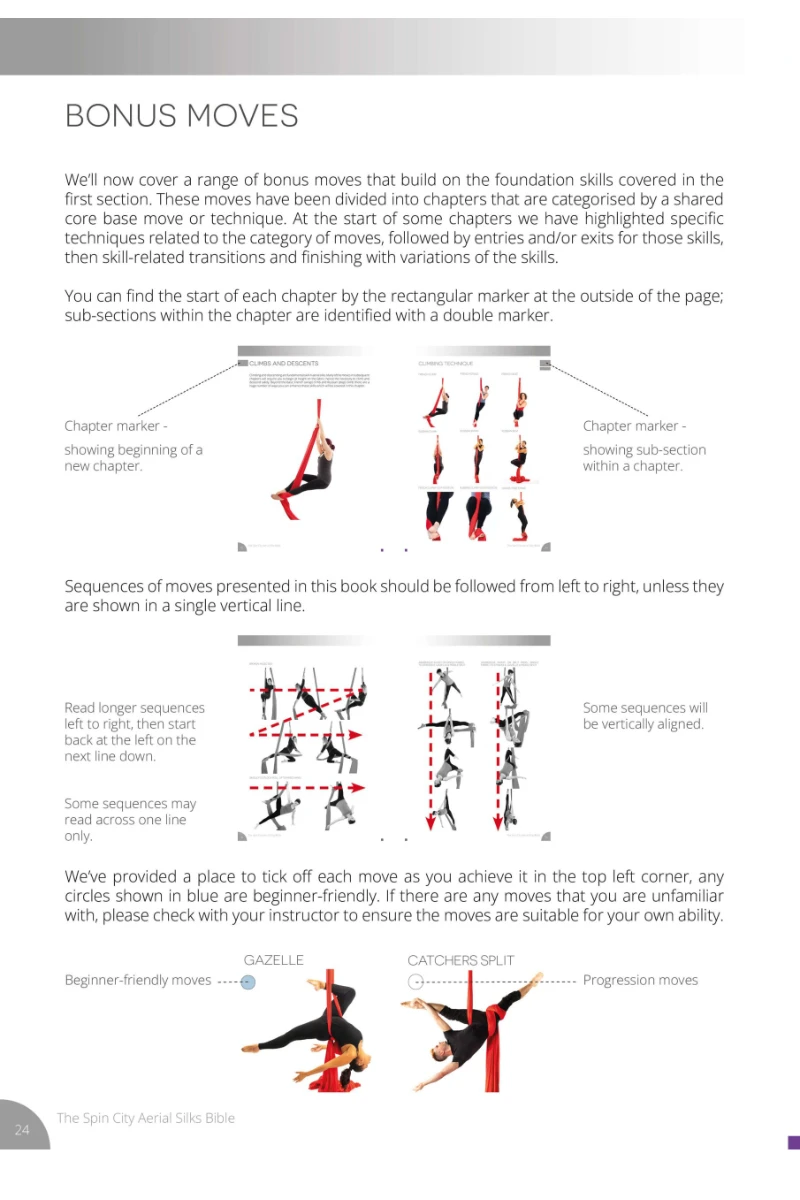 The Spin City Silks Bible contains over 3000 reference photos and is made up of two main sections. The first section contains the foundation skills for aerial silks – these are the building blocks that all other wraps, moves and skills are built upon and are also covered in the Spin City Foundation Aerial Silks Instructor Training Course. The second section contains bonus moves, which have been split into different categories, or families, including static poses, variations on core moves and dynamic moves.